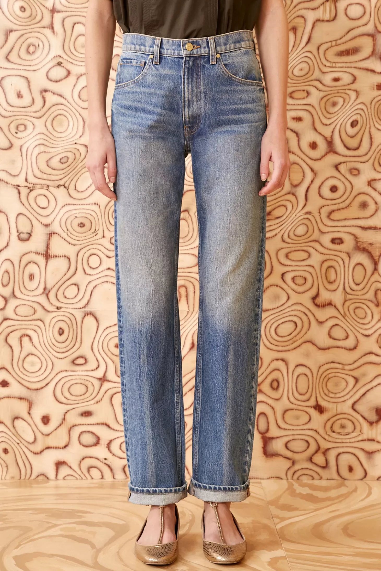 The Daphne Jean is a beloved silhouette in our classic medium indigo wash. This slim boyfriend style is handmade in Los Angeles with a relaxed fit, low-rise silhouette, and rolled cuffs. Cut from non-stretch denim, it features our signature logo-embossed leather patch and hand-hammered ring attached to the back belt loop.