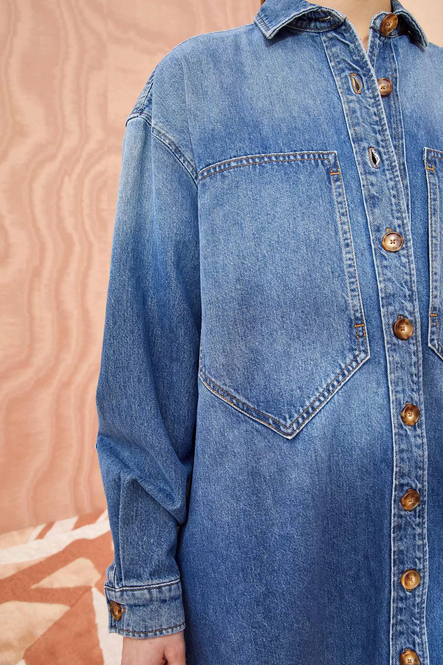 The Valerie is an oversized shirtdress crafted from our signature handmade denim in a perfect blue wash. This classic button-down shirt silhouette features oversized front pockets and loose sleeves that button at the cuff. Wear it as a mini dress or pair it with jeans in our Danube medium blue wash to achieve a full denim look.