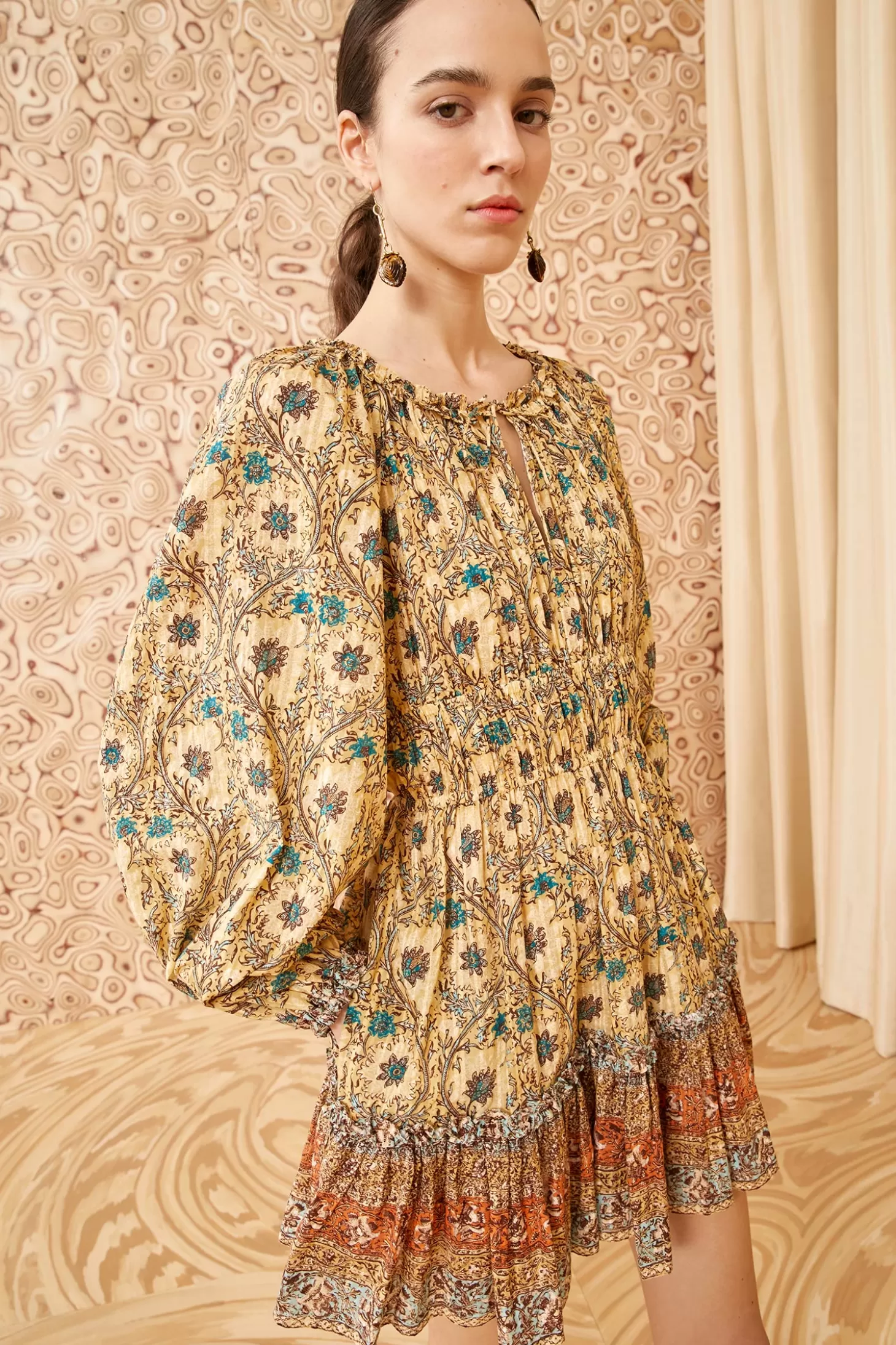 Crafted from airy shadow stripe cotton, our Val Dress arrives softly adorned with botanicals inspired by a 19th century Persian pint—the earthen yellow and green hues mimic the natural dyes used in the original pattern. This breezy frock has voluminous long sleeves with elastic cuffs, and elastic waist, and delicate ruffles at the neckline and skirt. The delicate neckties create a keyhole front.