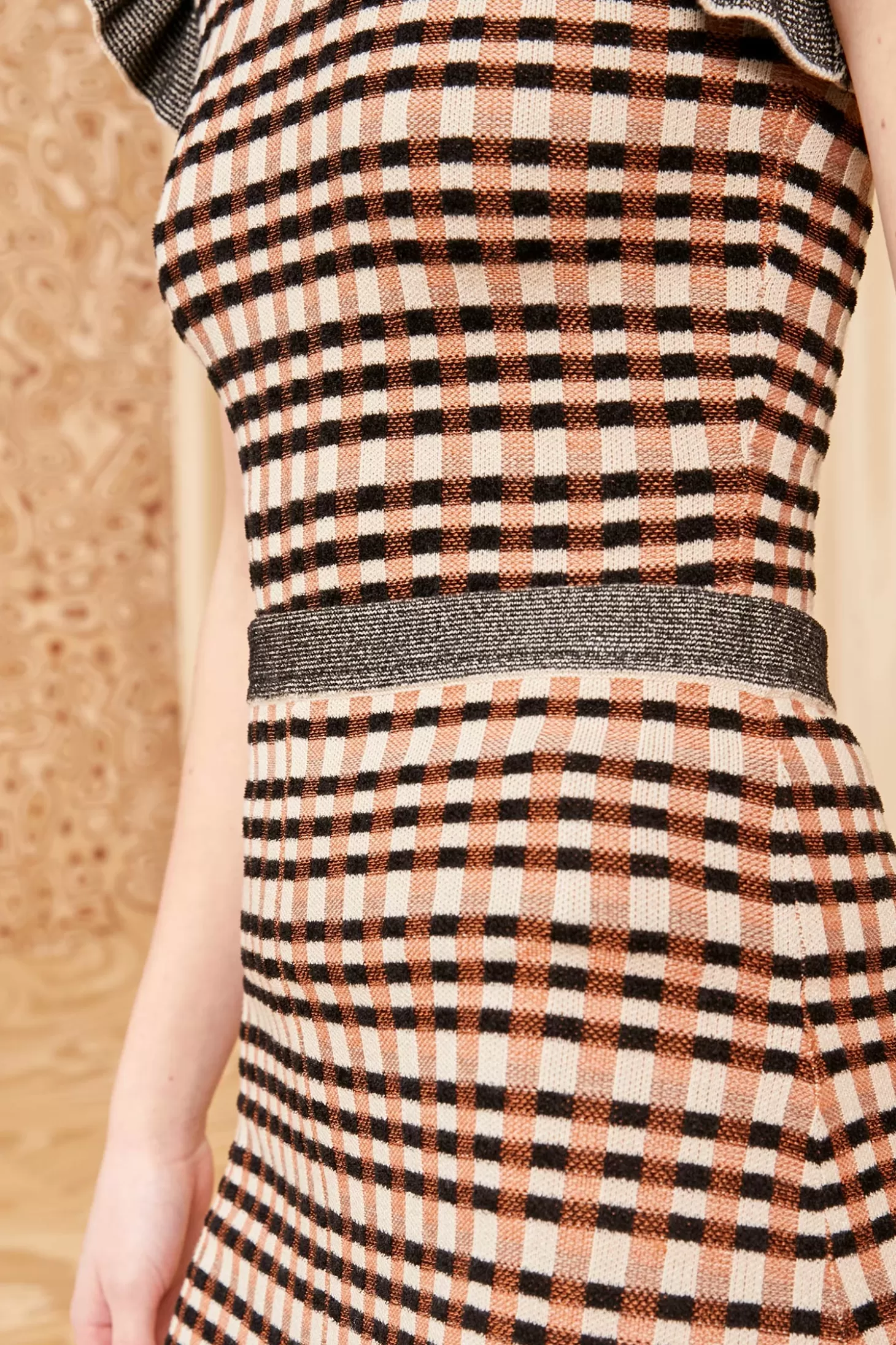 The Amal Skirt is crafted from soft, lightweight jacquard that combines dimensional brown and black yarns with varied stitches to create an intricate checked motif. This midi-length style features a skimming, straight cut and has an elastic waistband for comfort. Pair with our matching Rea Top for refined coordination.