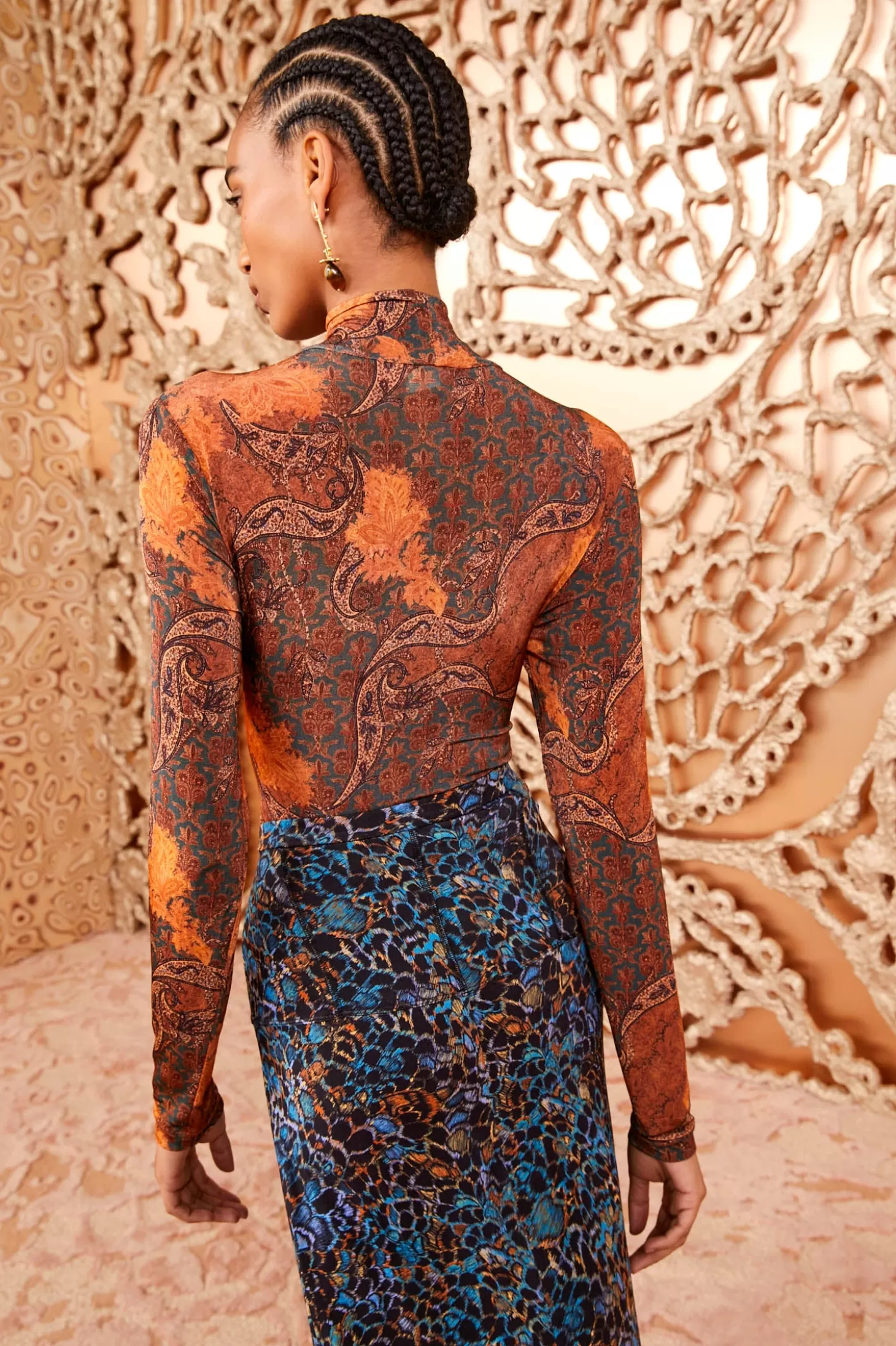 Featured in Look 12 of our Autumn/Winter 2024 runway show, our Aurelia Turtleneck in lightweight tricot jersey is a forever favorite silhouette, printed in a chimerical blend of swirled and layered paisley that brings together a mélange of patterns in gold, orange, and brown. This long-sleeve top has a close fit that makes it perfect for layering or wearing on its own, while the high neck adds a touch of elegance.