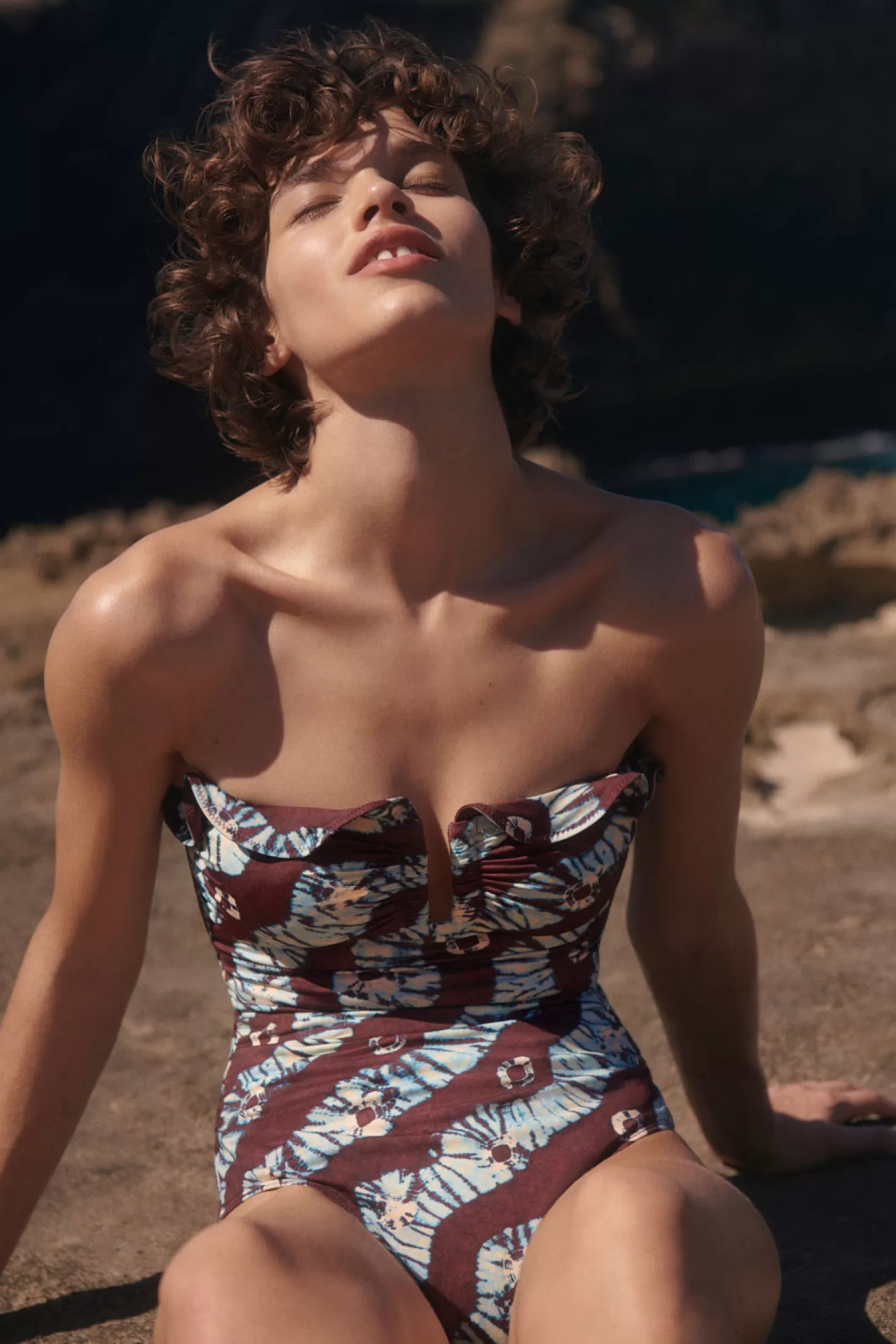 Our new Menorca Maillot is a strapless beauty trimmed with delicate ruffles at the top of the bust. A classic shibori print has been reimagined into a diagonal stripe with accent dots in graphic brown and blue. It has a notched front with boning at the sides for a secure fit and provides full coverage at the bottom.