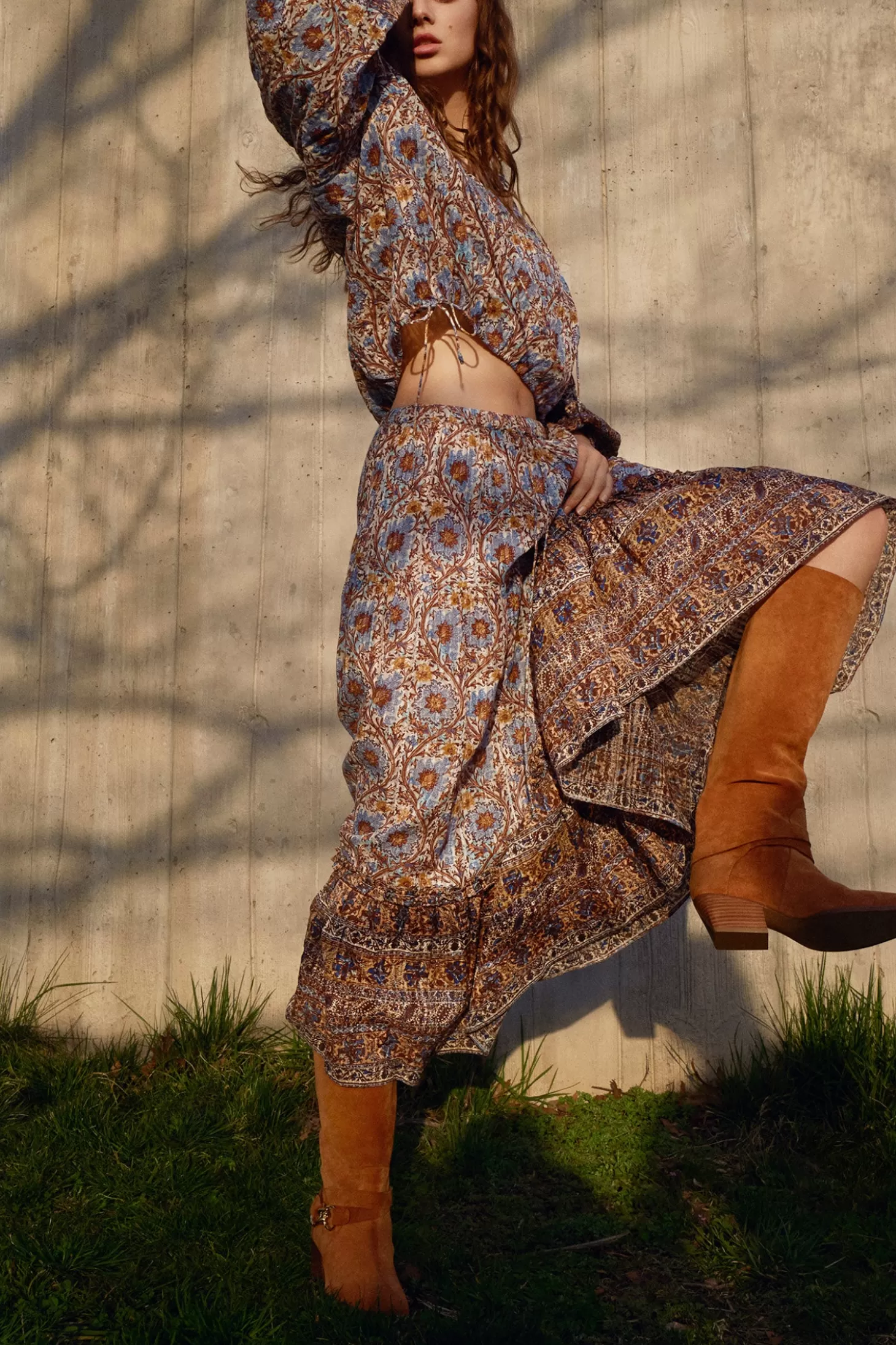 A floaty beauty, our Paige Skirt arrives in airy shadow stripe cotton with dynamic blooms rendered from a vintage Persian print—the natural blue, orange, and red hues mimic the natural dyes used in the original pattern. This midi-length style features a drawstring waist, side pockets, and pairs beautifully with our Silva Blouse.