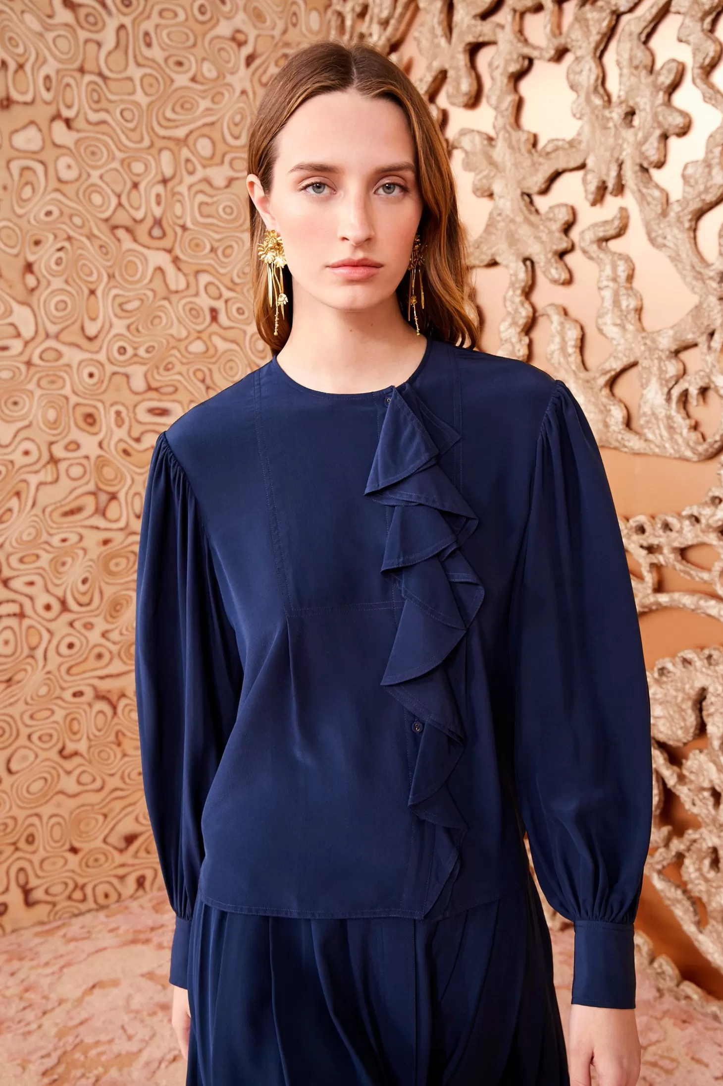 The Adelaide Blouse arrives in luxurious silk crepe de chine that’s tinged the richest shade of midnight blue. A romantic lovely, this button-down features asymmetric ruffles that cascade down the front and voluminous long sleeves structured by buttoned cuffs.