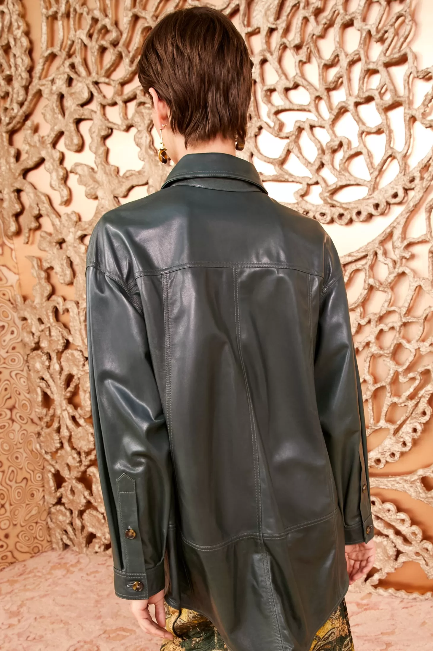 Our bestselling Apollo Jacket returns in an irresistible shade of jasper green. It has an A-line silhouette that’s elegantly oversized, tonal seam details, and fastens with lustrous buttons with tortoiseshell motifs. This forever piece can be worn as a jacket, or a sleek mini dress when fully buttoned up.
