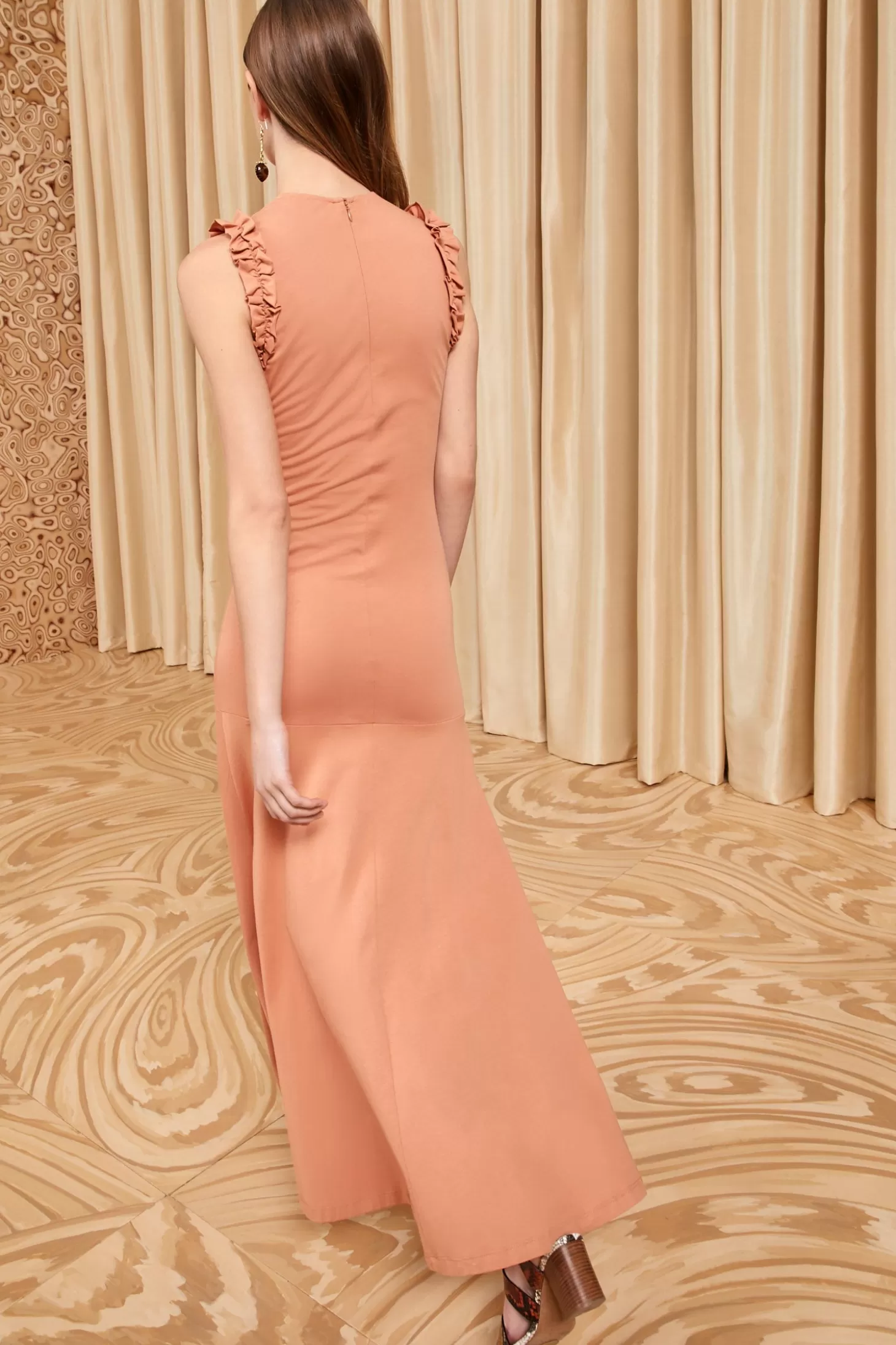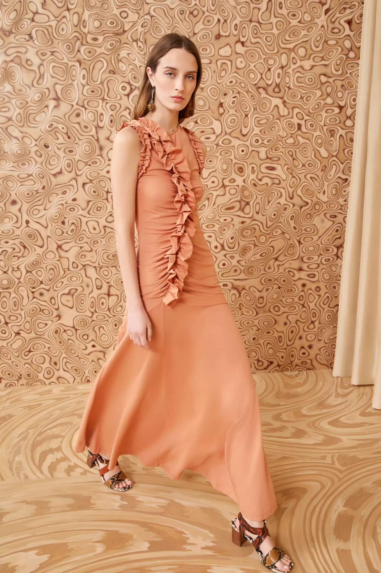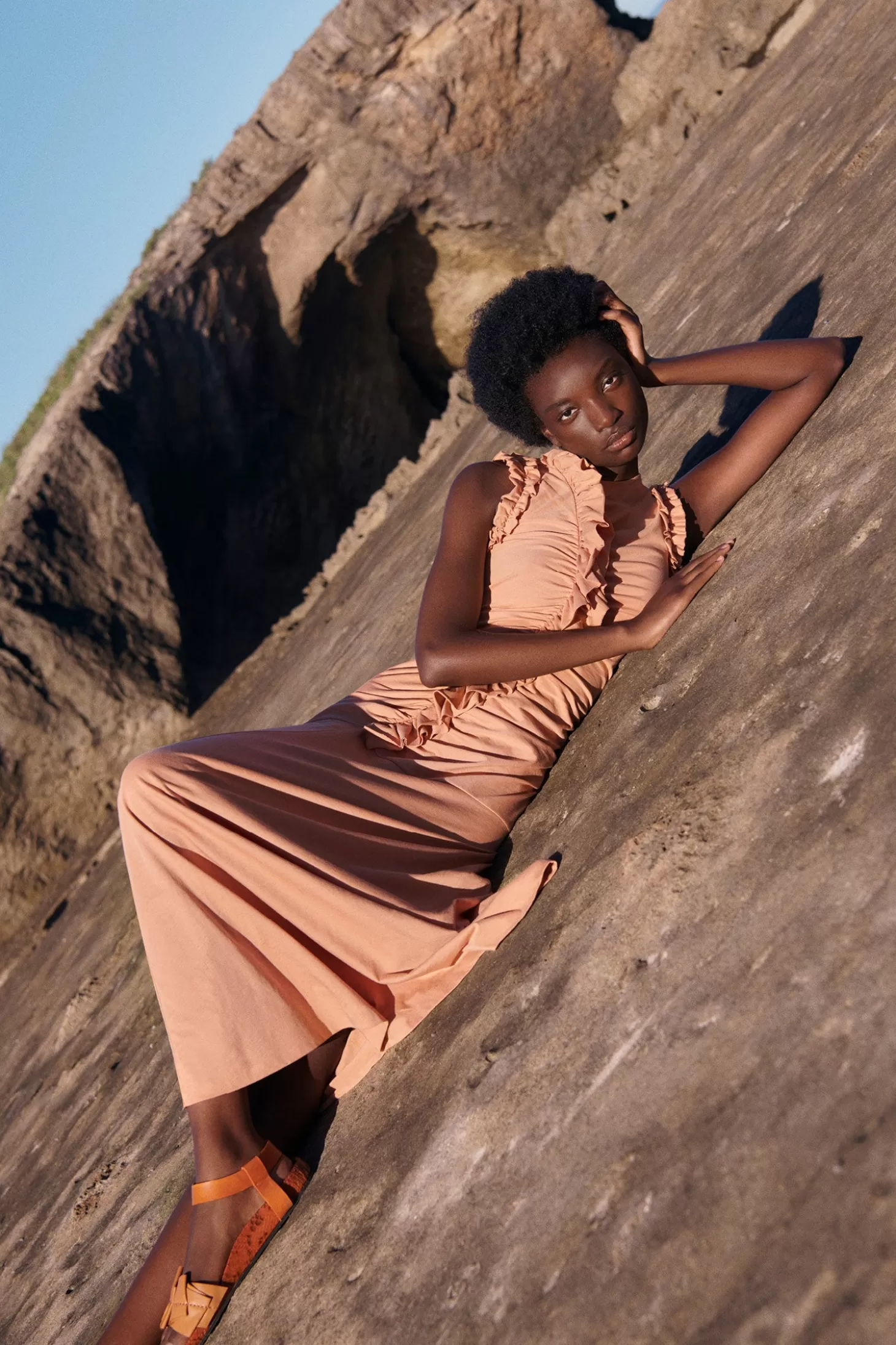 Our Bendetta Dress is lovingly made from soft organic jersey as part of our continued efforts to support responsible production methods and lower our impact on the planet. Arriving in a lovely muted pink, it has ruching that sculpts the form and is embellished with romantic ruffles at the sleeves and front. It unfurls to a classic midi length and fastens with a concealed back zipper.