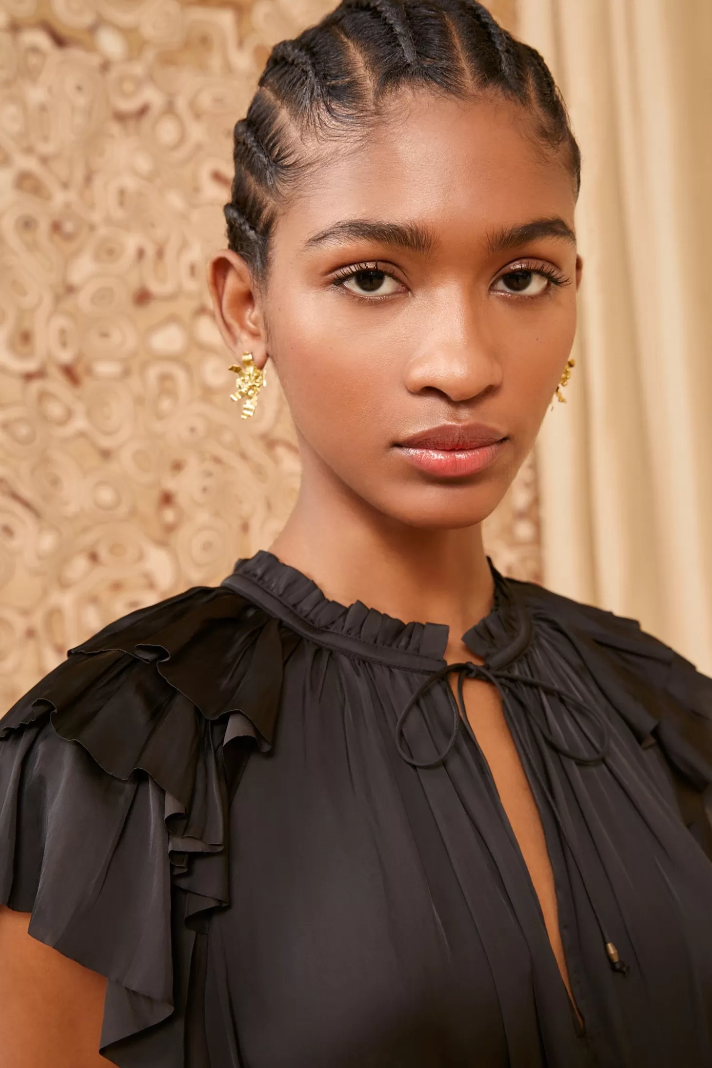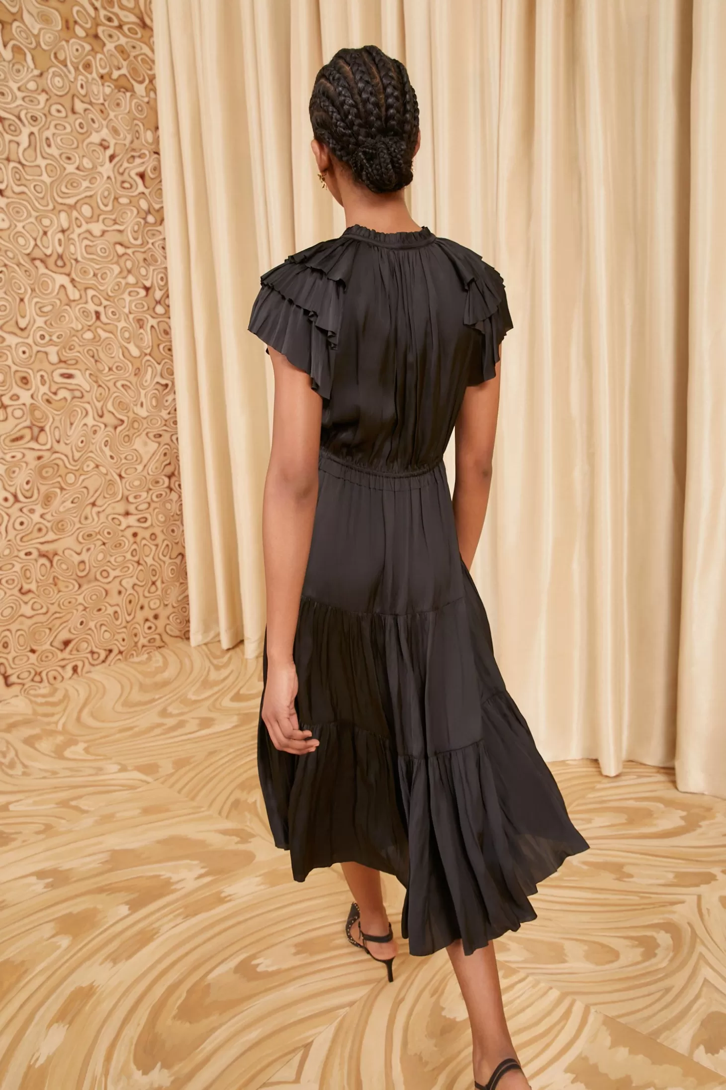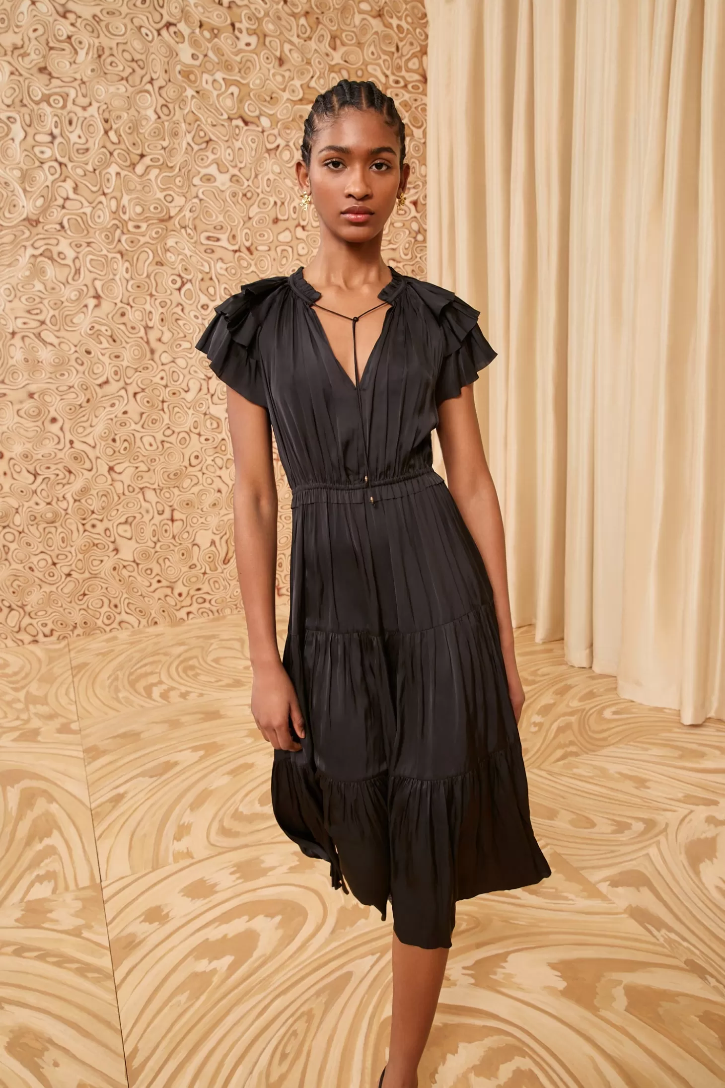 The Blaire Dress is expertly crafted from our signature plissé satin in classic black, making it an effortless choice that’s perfectly suited for formal occasions. This flattering dress features a plunging neckline with ties, tiered ruffles at the sleeves, and a midi-length skirt that is unlined.