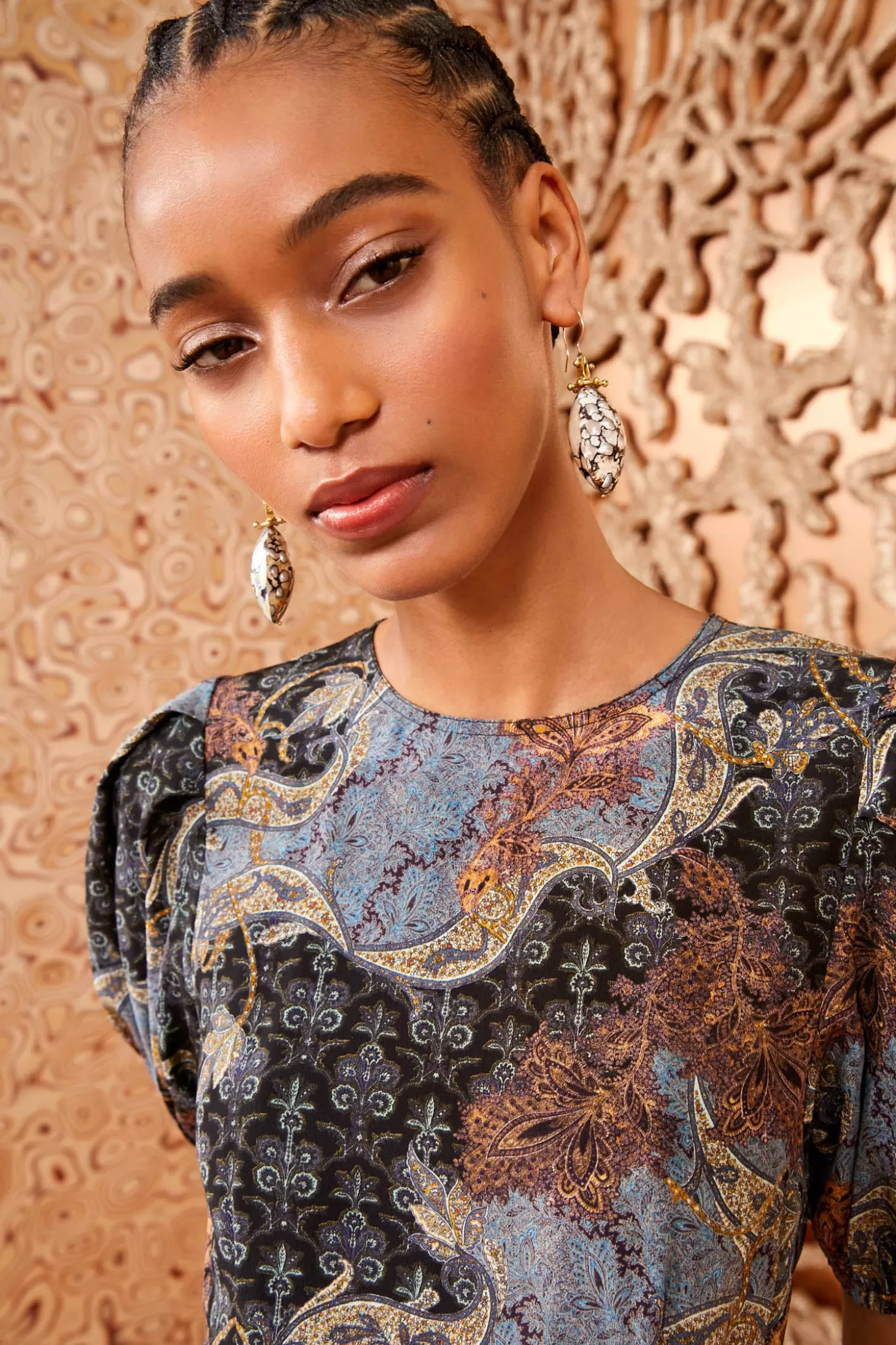 Tailored from luxurious silk crepe de chine, our Calais Dress is patterned with an elaborate blend of swirled and layered paisley motifs. Awash in blue, yellow, and gold hues, this bestselling silhouette features our much-adored puff sleeves and a streamlined shape that’s designed to fit close to the body. This midi dress fastens with a concealed back zipper.