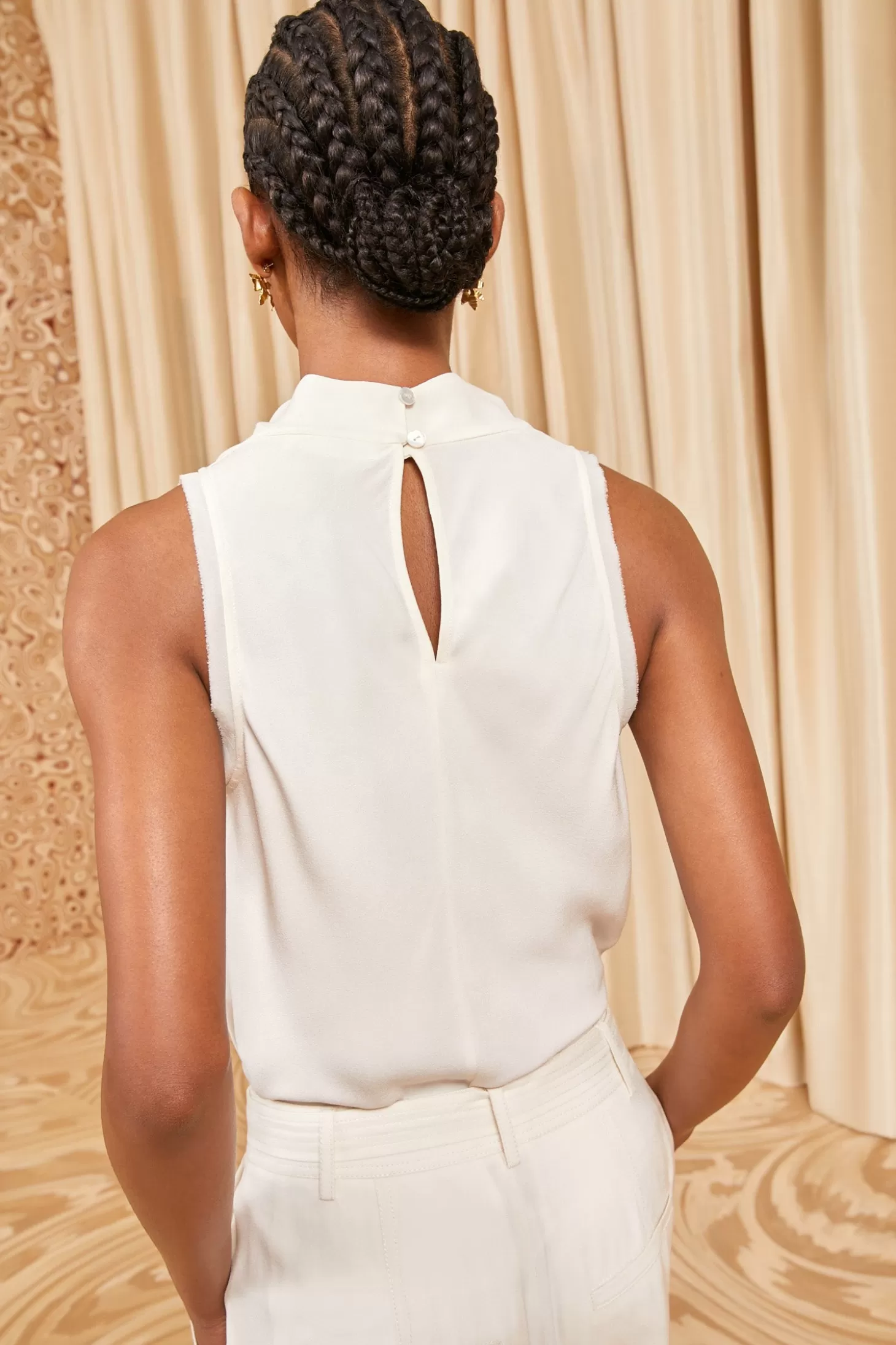 The Cleo Top is crafted from our textured satin-back crepe in the most elegant pristine white. This sleeveless, bias-cut silhouette features a softly draped cowl neckline and flowing bodice for an effortless look. It fastens with a buttoned keyhole at the back.
