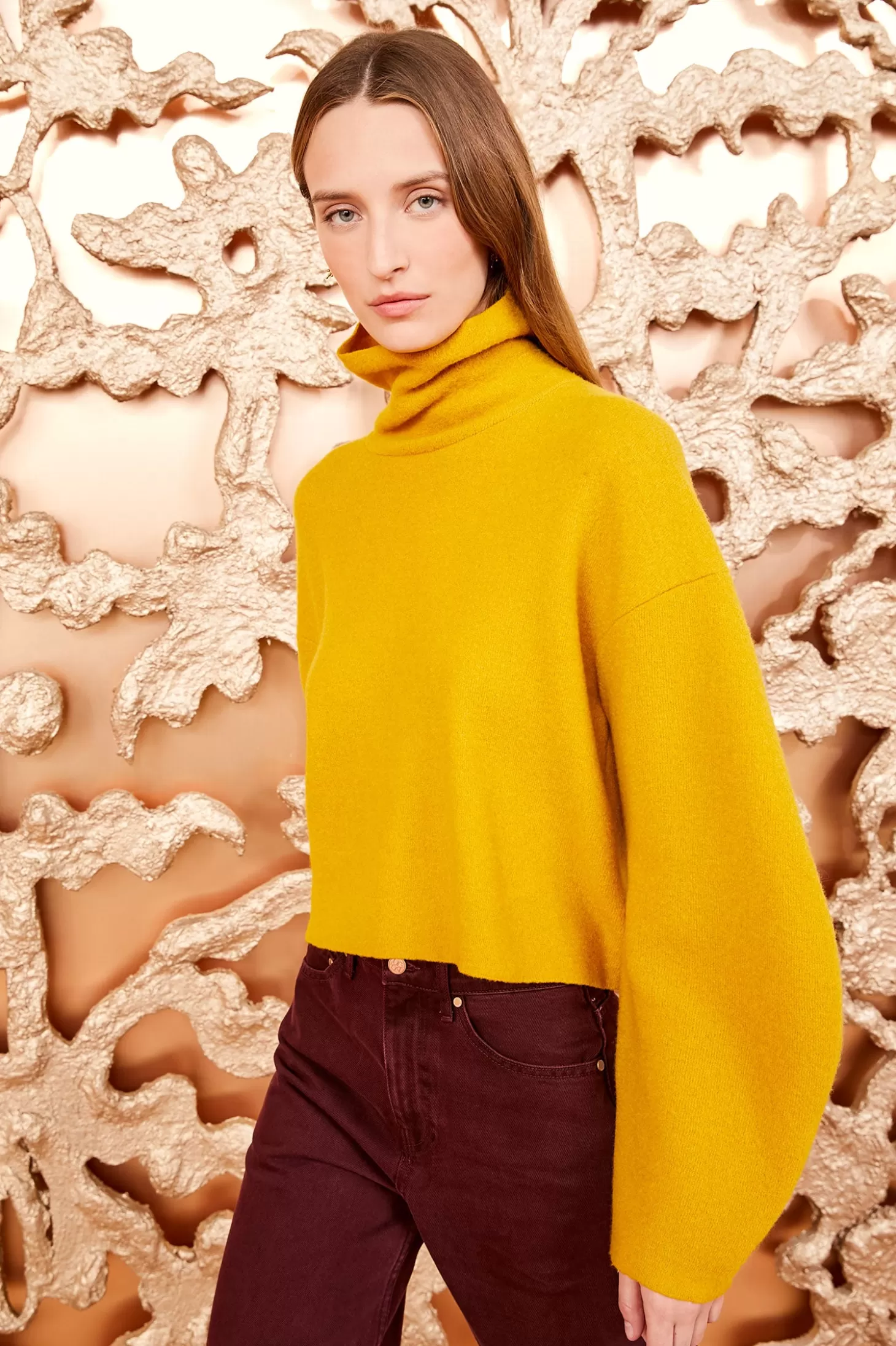 Featured in Look 4 on our Autumn/Winter ‘24 runway, the Leona Turtleneck is made from felted merino wool that’s saturated a golden turmeric hue. This cozy, yet lightweight top boasts a streamlined silhouette with long voluminous sleeves, a cocooning silhouette, and an elegant high neckline.