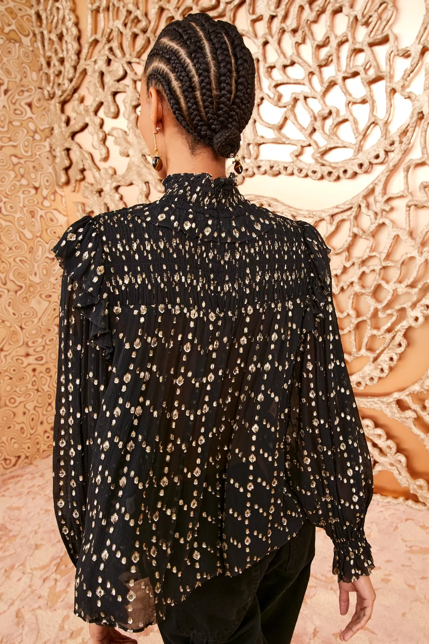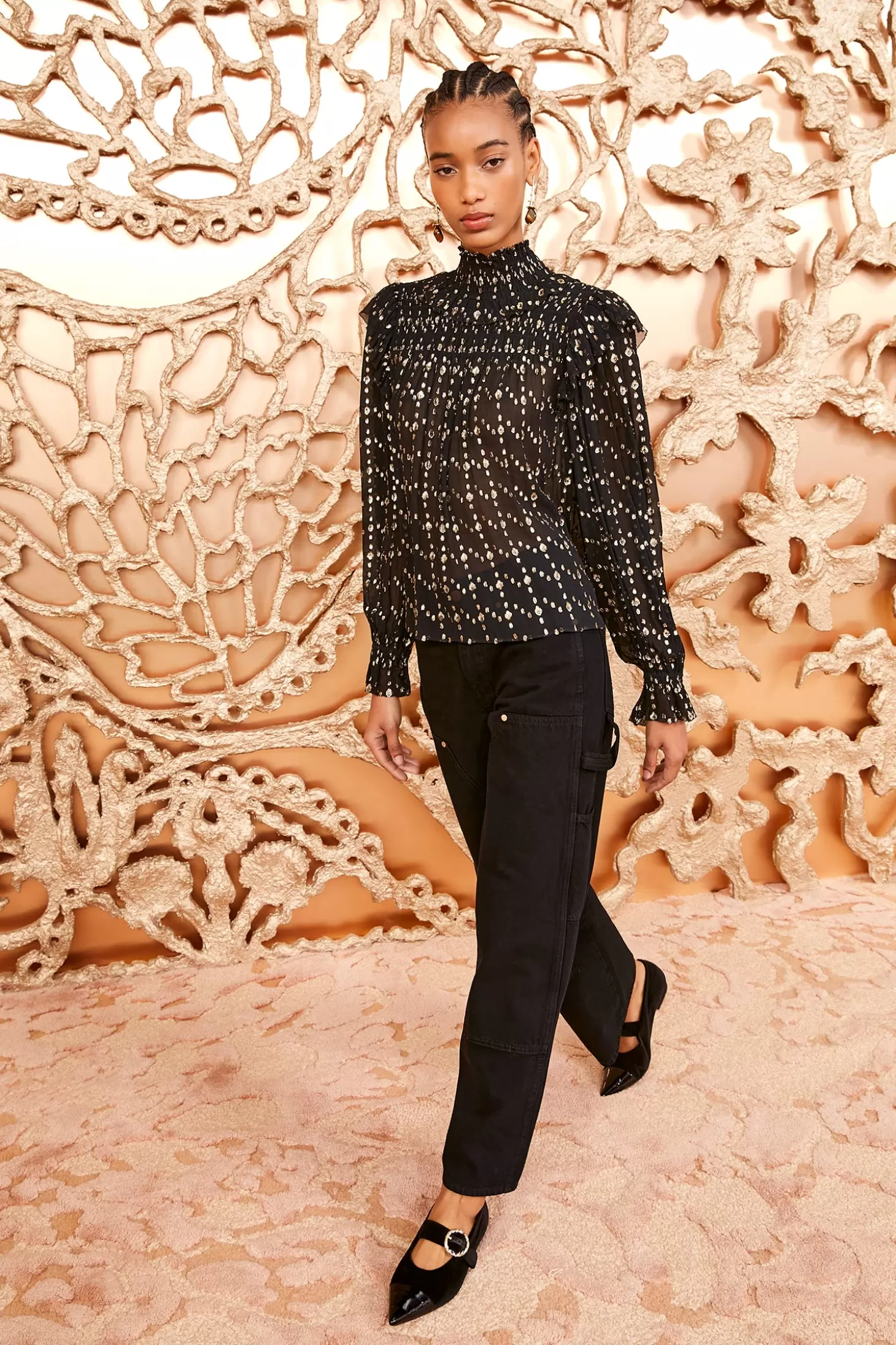 Crafted from airy crinkle silk chiffon, our Mila Blouse is adorned with golden lurex dots that gleam against a timeless black backdrop. This romantic style has a high neckline framed by gorgeous smocking, a flowy silhouette, and billowing sleeves cinched with elastic cuffs. It pairs effortlessly with our seasonal denim and tailored separates.