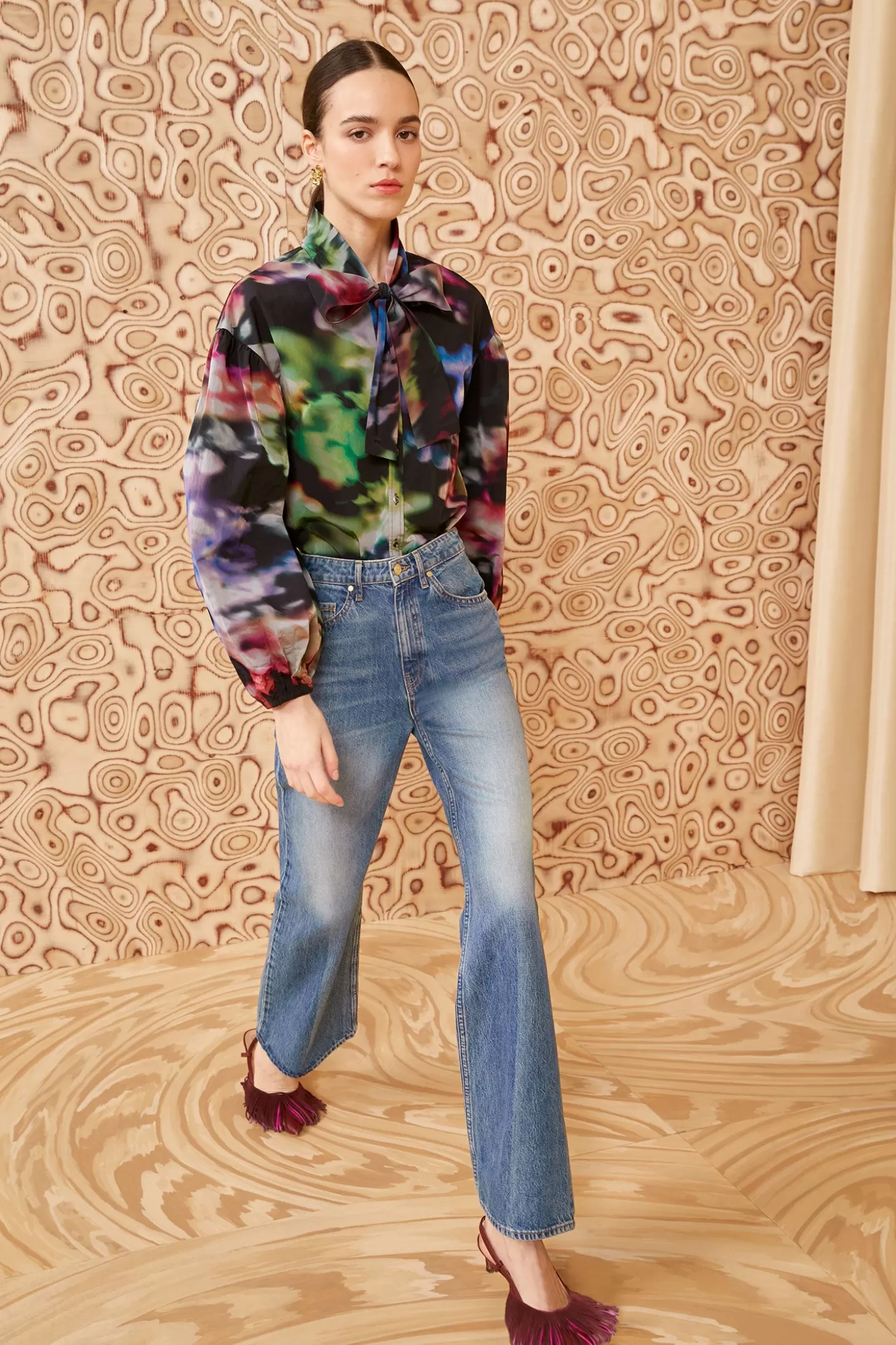 A sculptural beauty, our Albie Blouse arrives with our signature voluminous sleeves and has neckties that fasten into a bow for a romantic touch. Made from our signature poplin, it is richly patterned with darkly electric florals that are scaled up and artfully blurred. This style fastens with buttons down the front.