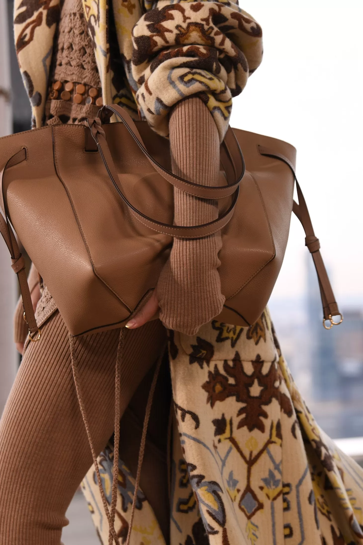 As featured in Look 29 of our Autumn/Winter ’23 Runway Show, the Alma Everyday Tote is the newest wear-everywhere bag to join our accessories collection. This beige tote is the perfect day size—spacious but still compact and elegant. It features exquisite braided detailing at the handles and is lined in suede.