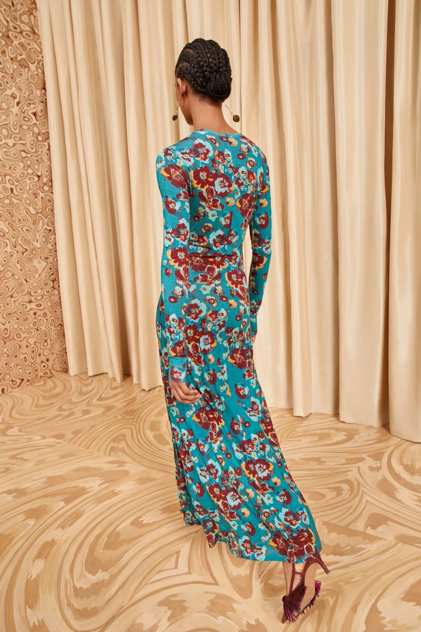 Our Ceryse Dress arrives in our tissue weight jersey adored for its silky-soft feel. Designed with architectural ruching, this long-sleeve dress skims the form and flows down to an ankle-grazing length. This effortless style features beautifully distorted blossoms in red, blue, and orange that tumble against a green backdrop.