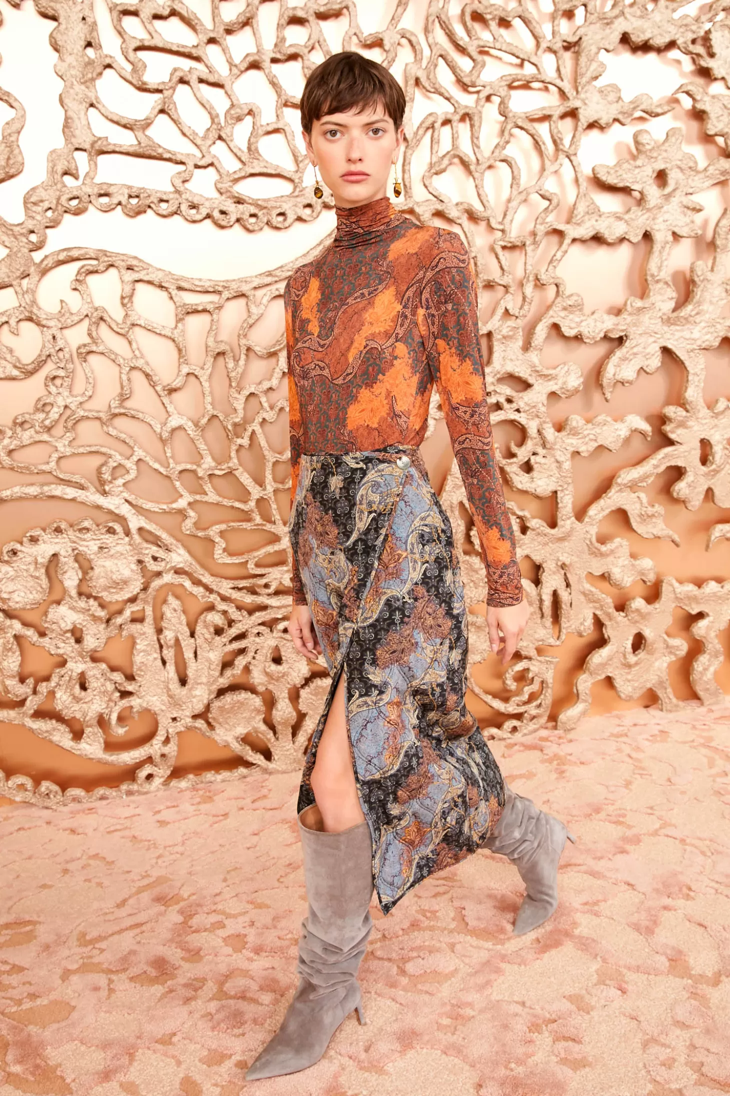 Our Jeune Skirt is masterfully cut from luxurious silk crepe de chine with light quilting for added dimension. It’s splashed with elaborate paisley motifs that swirl in notes of blue, yellow, and gold. Designed to sit high on the waist, this midi skirt has a wrap silhouette that flatters the form and fastens with internal and external buttons at the waist.