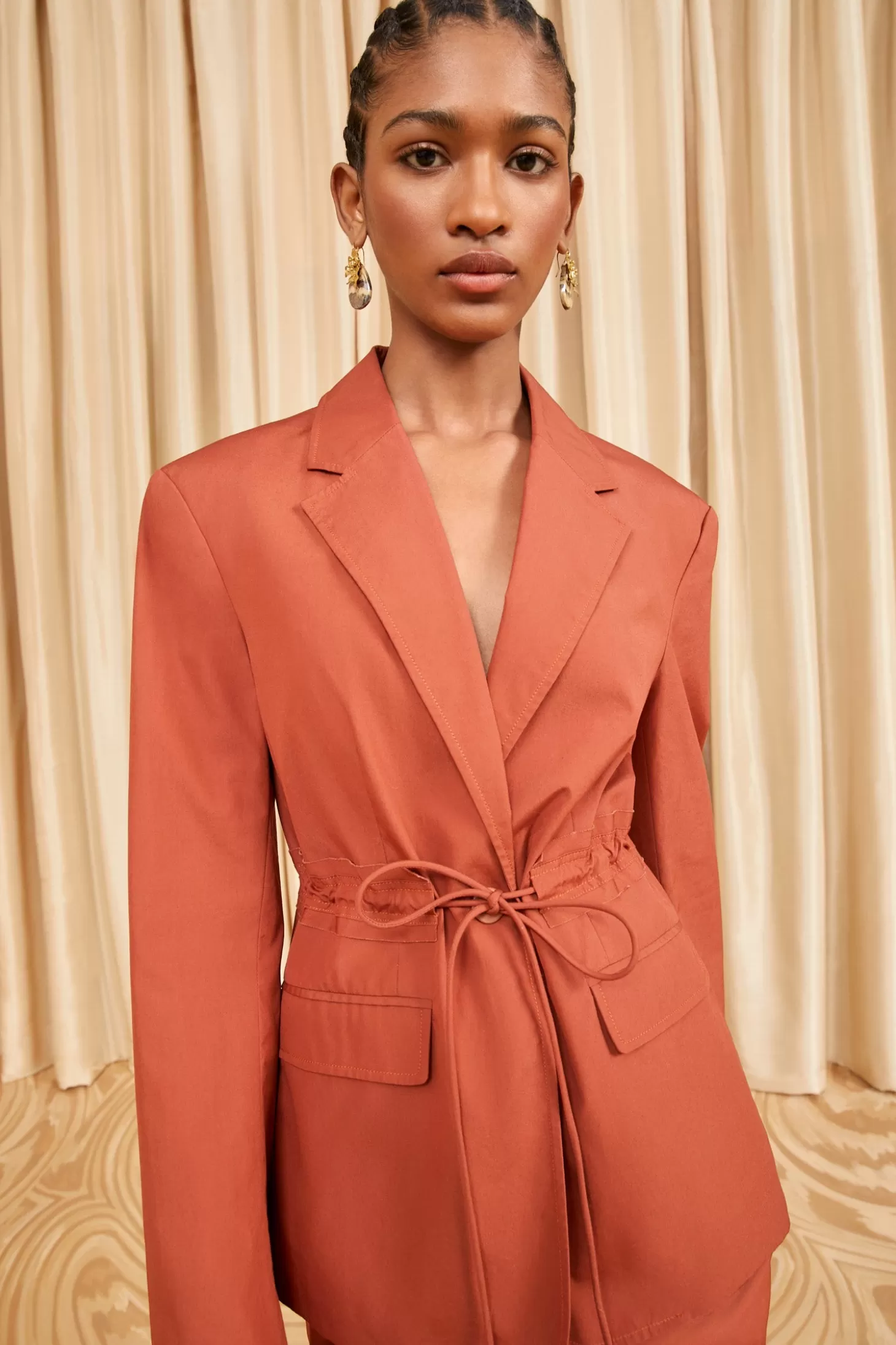 The Marisol Jacket is a versatile and sophisticated style crafted from premium cotton chino in a rich saffron orange. The tailored silhouette exudes timeless elegance, while the tie detail at the waist adds a contemporary and feminine touch. The lightweight and breathable cotton material ensures year-round wearability, making it a versatile piece that seamlessly transitions from season to season.