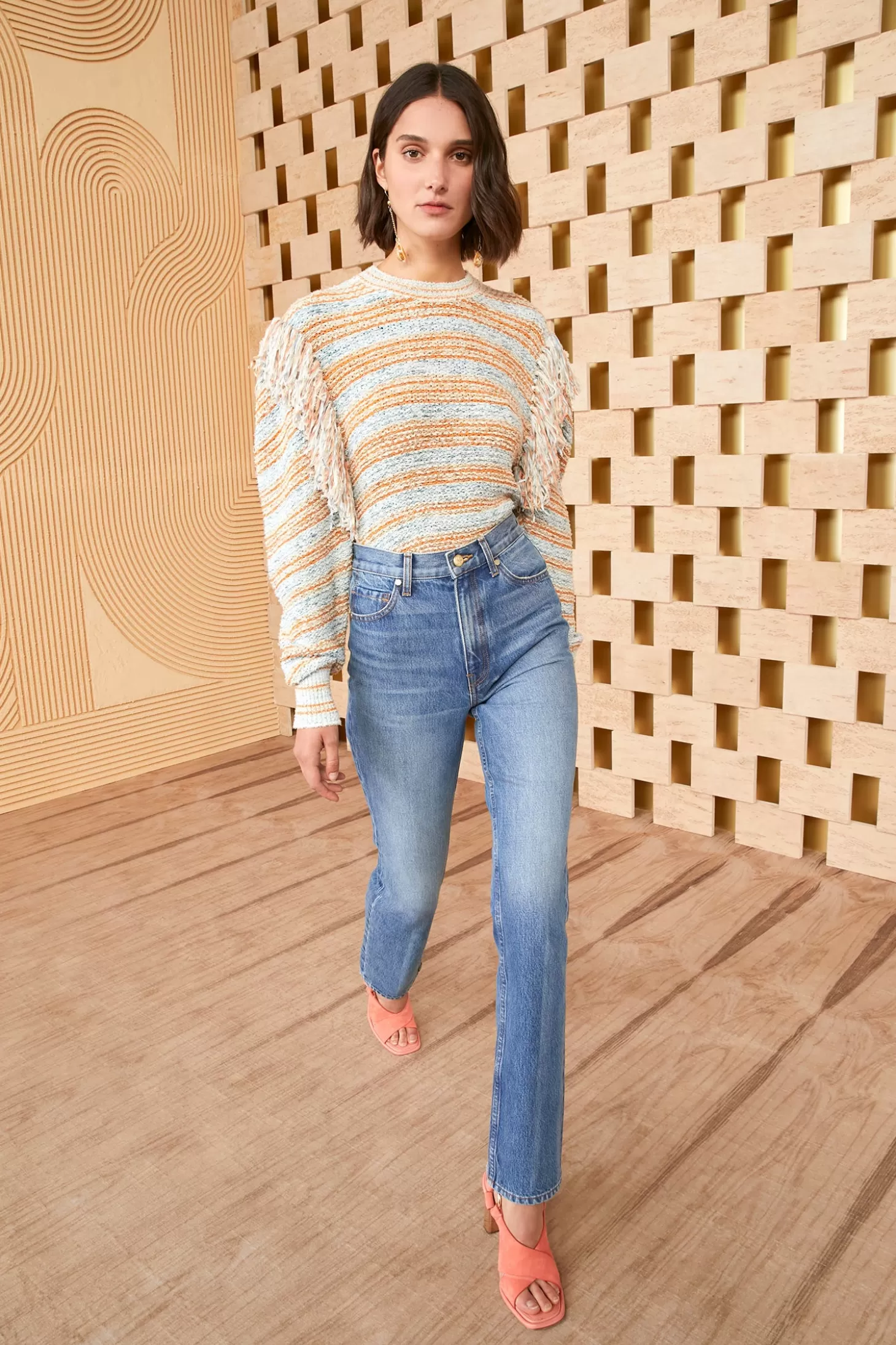 The Agnes Jean returns this season in Medium Indigo Wash. This straight leg silhouette is handmade in Los Angeles, and features a high-waist and elegant, clean lines. This jean is cut in non-stretch denim with a leather logo-embossed waistband patch and a hand-hammered ring attached to the back belt loop.