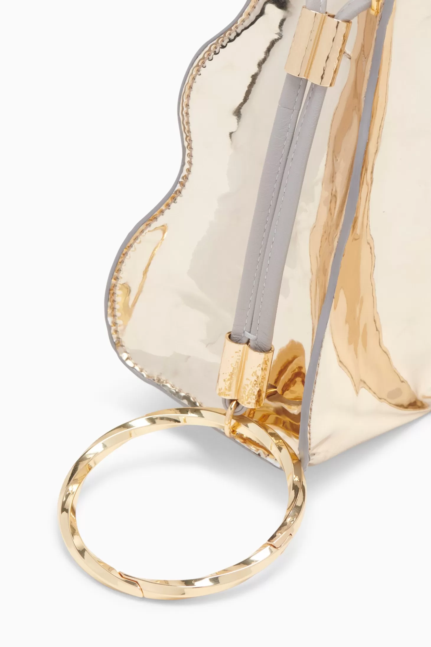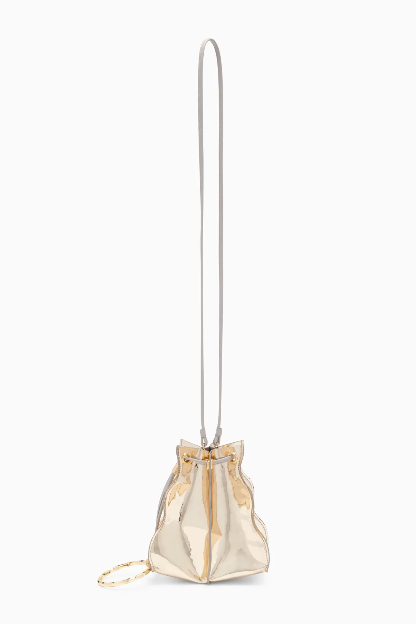Featured throughout our Autumn/Winter ‘24 runway, our beloved Adria silhouette is updated for the season in a sleek and compact pochette. This small but mighty bag is carved from strips of light metallic gold leather that mimic the beauty of undulating waves and is finished with a Dove gray trim. It is topped with an elegant bracelet-inspired ring that’s detachable and has a removable crossbody strap.