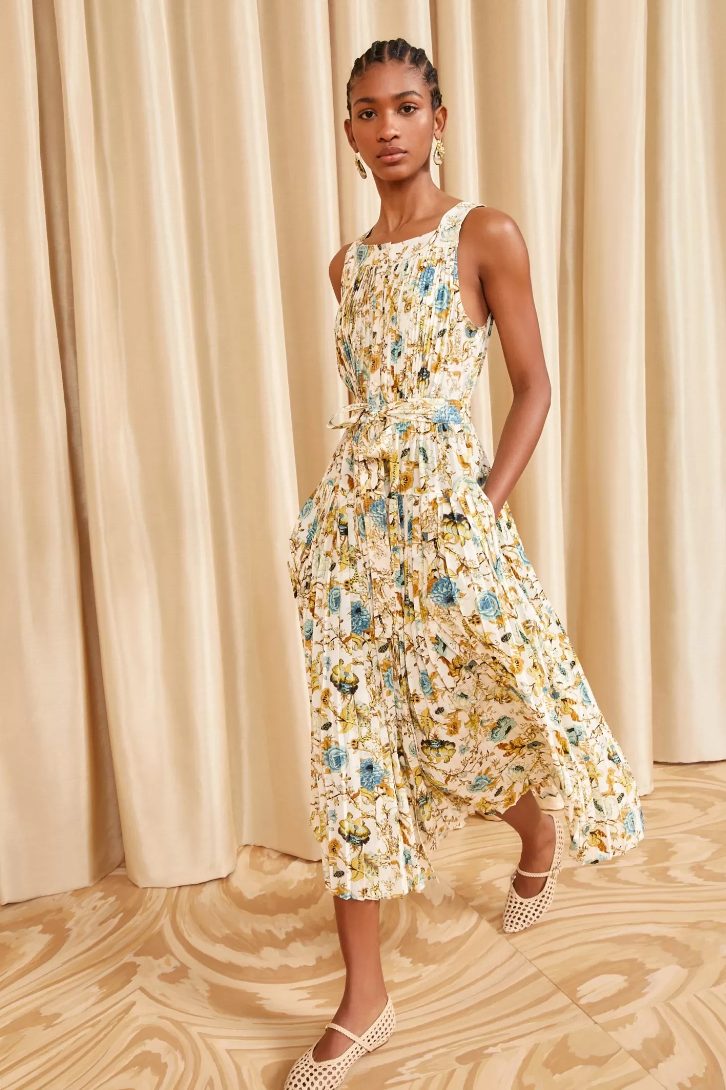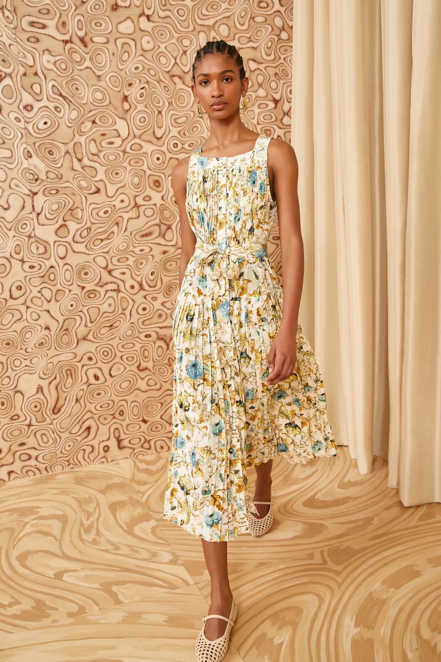 The Annabeth Dress is crafted from signature luxurious silk crepe de chine awash in botanicals inspired by 19th century French florals. Set against a cream backdrop, this bestselling silhouette features a square neckline and wide straps that create a chic and modern feel. The fully pleated skirt adds a touch of femininity and movement, making this midi dress a perfect choice for any occasion.