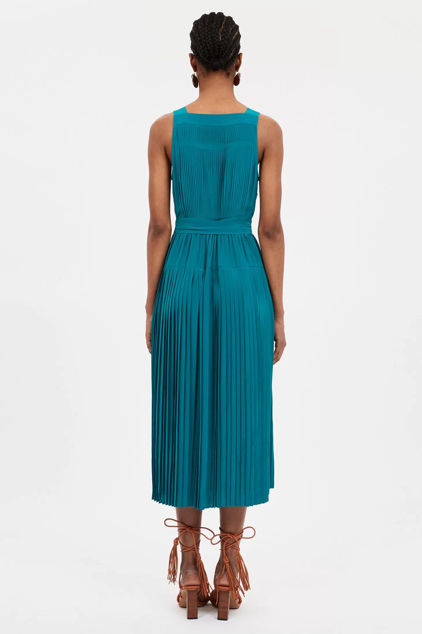 The Annabeth Dress is crafted from signature luxurious silk crepe de chine awash in Jade. This bestselling silhouette features a square neckline and wide straps that create a chic and modern feel. The fully pleated skirt adds a touch of femininity and movement, making this midi dress a perfect choice for any occasion.