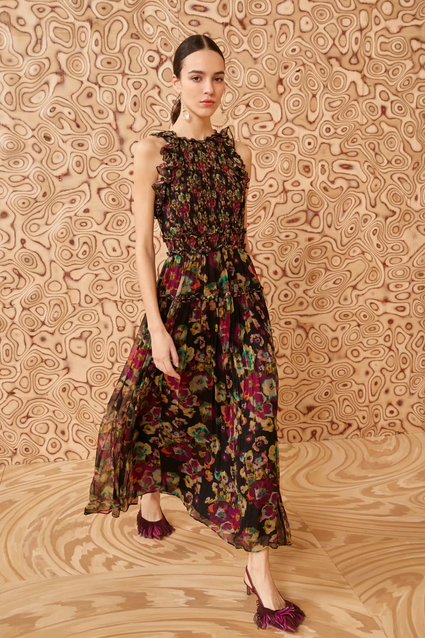 Our Elea Dress is enriched with electric, watercolor florals in a gorgeous combination of purple, orange, and green. Crafted from luxurious crinkle silk chiffon, this sleeveless style has a round neckline and is ornamented with dancing, frayed-edge ruffles that add texture. It floats to a midi-length hemline, is fully lined, and fastens with a concealed back zipper.