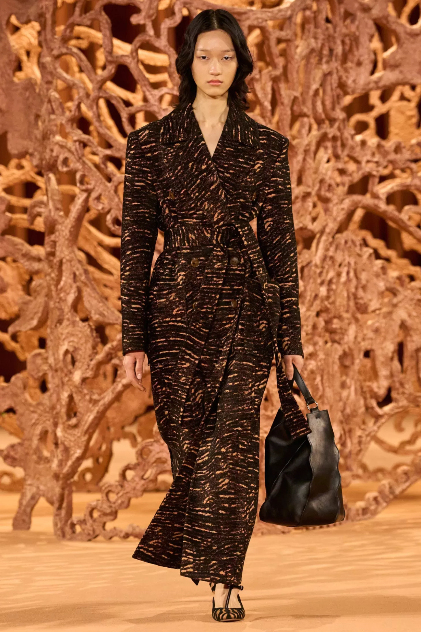 Debuting in Look 26 of our Autumn/Winter ‘24 runway show, the Elowyn Coat is beautifully tailored from our Italian chenille fabrication with a soft, velvety finish. Featuring our animalesque onyx print in warm tan and black, this cozy layer has an elongated silhouette framed by boldly structured shoulders, a double-breasted front, waist-cinching belt, and patch pockets.