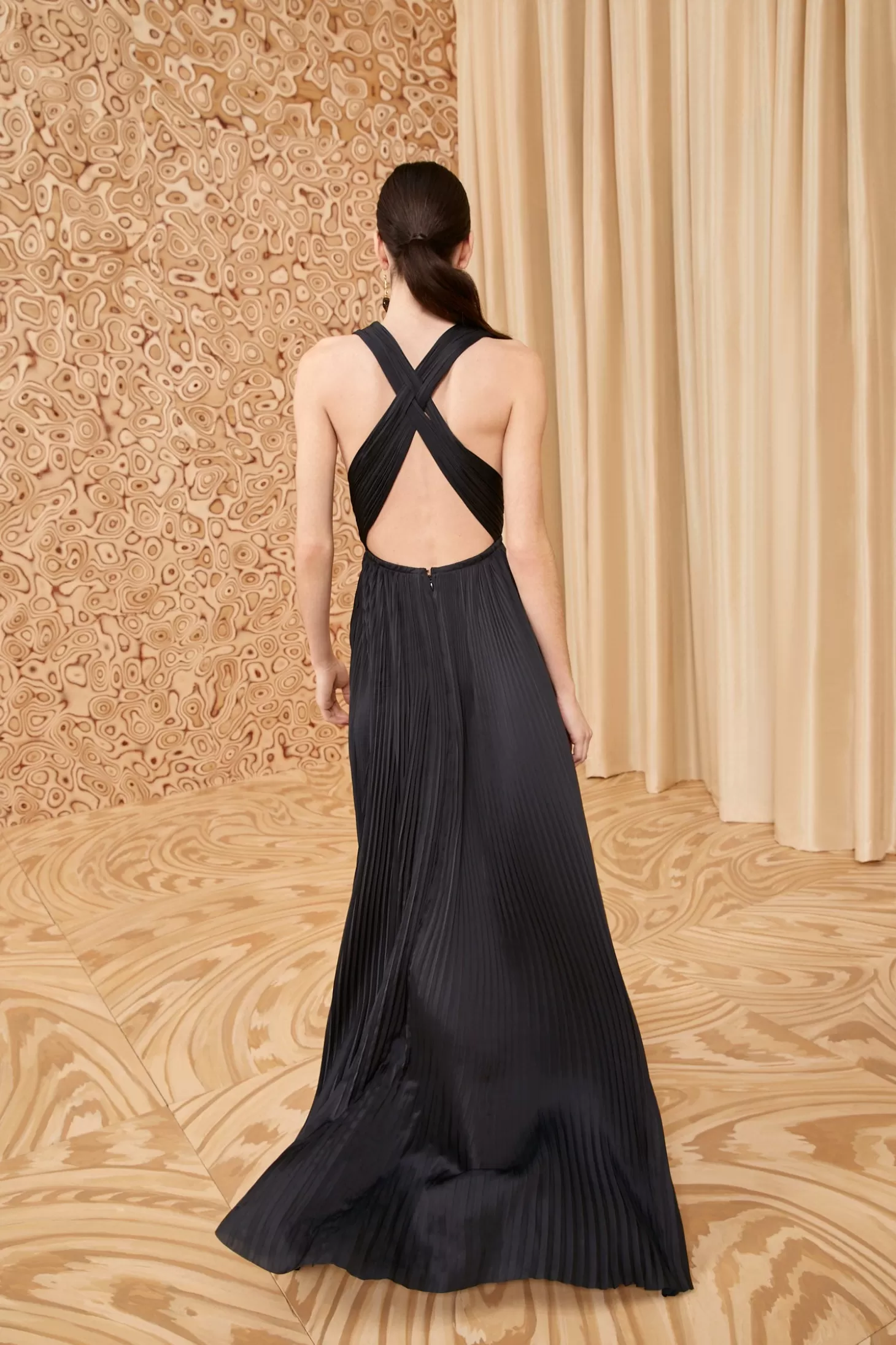 Our most-cherished plissé satin is re-envisioned as our flowing Veda Gown. Beautifully knife pleated, it has a dramatic V-neckline with elastic gathers at the waist for comfort, and turns to reveal an open back with straps that are woven to crossover for a special touch. This timeless black dress cascades to a floor-sweeping hem, perfect for making an entrance to your next occasion. It fastens with a concealed back zipper.