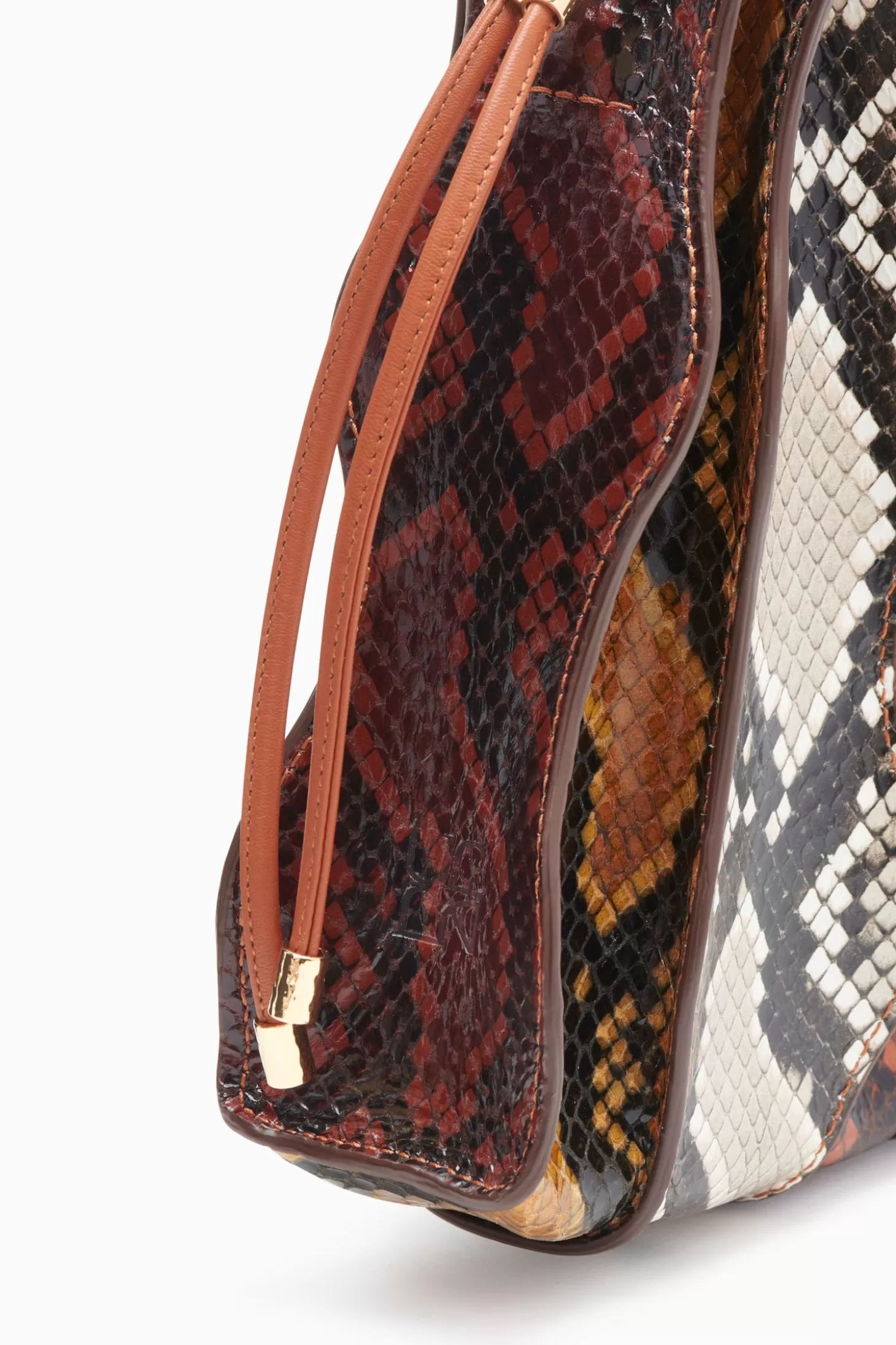 This bold beauty is a richly detailed addition to our Adria lineup. Sculpted in Italy, this crossbody bag features strips of python-embossed leather sewn together in an artfully color-blocked motif and then painted at the edges to accentuate the beauty of the waves. Alive with brown, gold, and red hues, it has a drawstring opening that reveals a suede-lined interior sized to fit your essentials and is finished with lustrous antique brass accents.