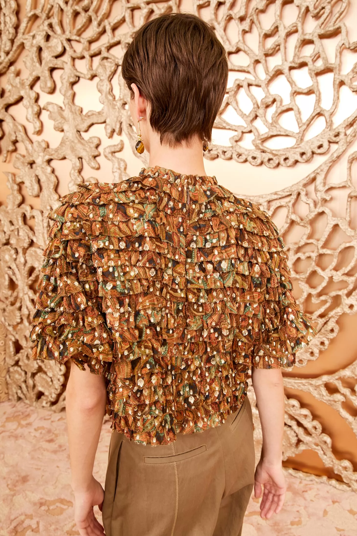 Visually stunning, our Carmella Blouse is made from crinkle chiffon that flickers with lurex dots woven into the fabric, bringing a gilded touch to the swirling, gold and brown paisley print beneath. This short-sleeve style has a round neckline and a relaxed fit that’s exquisitely tiered and ruffled throughout. It fastens with a center-back zipper.