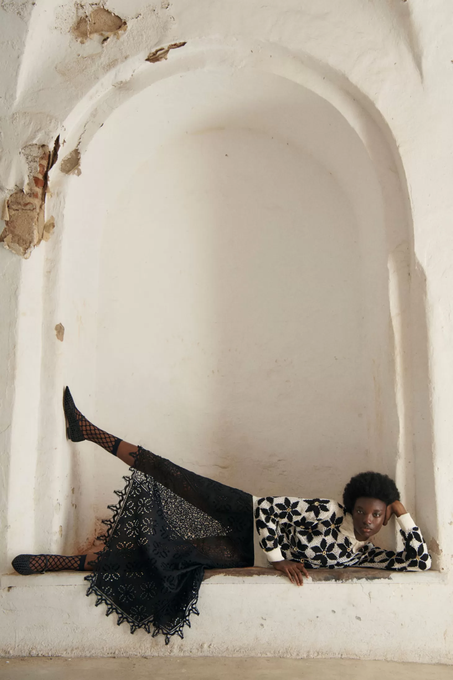 Featured in Look 7 of our Pre-Fall 2024 Lookbook, the Solara Skirt is a stunning midi-length style crafted from patchwork linen lace that’s carefully engineered specifically for each piece. This feminine black skirt comes lined and pairs effortlessly with our hand-crochet Nico Pullover for a unique and dimensional look. It is designed to sit at your natural waist, has a fixed waistband, and fastens with a concealed side zipper.